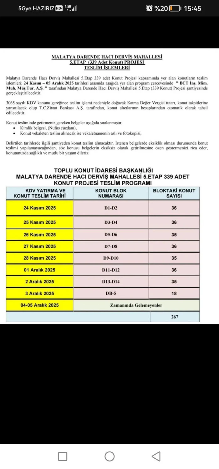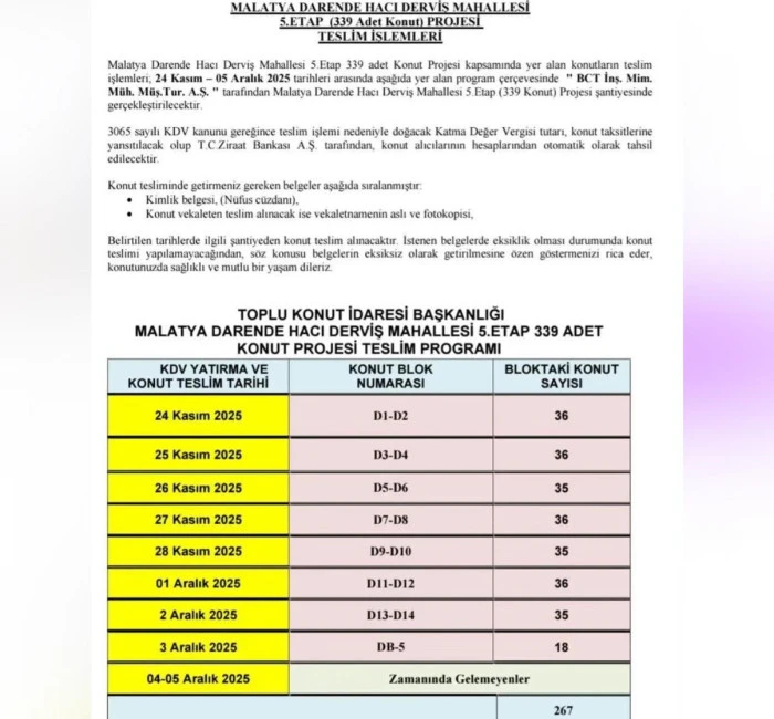 TOKİ, vatandaşların belirtilen tarihlerde şantiye alanında hazır bulunmalarını ve işlemlerin hızlı yürütülebilmesi için gerekli belgeleri eksiksiz şekilde getirmelerini istedi.