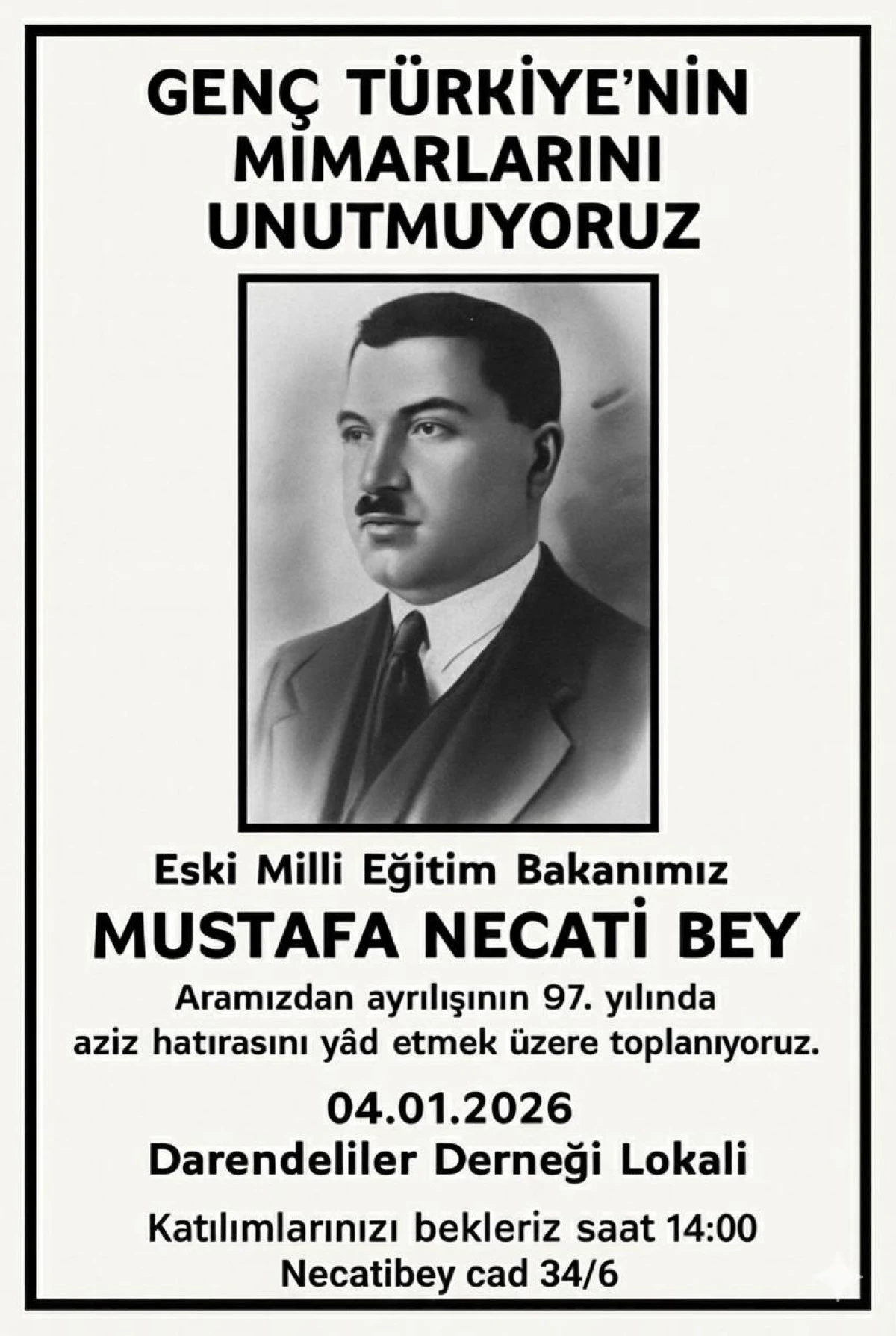 Cumhuriyetimizin kuruluş yıllarında eğitim alanında üstlendiği görevlerle iz bırakan, Darendeli hemşehrimiz ve Millî Eğitim eski bakanı Mustafa Necati Bey, ölümünün 97. yılında Ankara Darendeliler Derneği tarafından Ankara’da düzenlenecek programla anılacak.