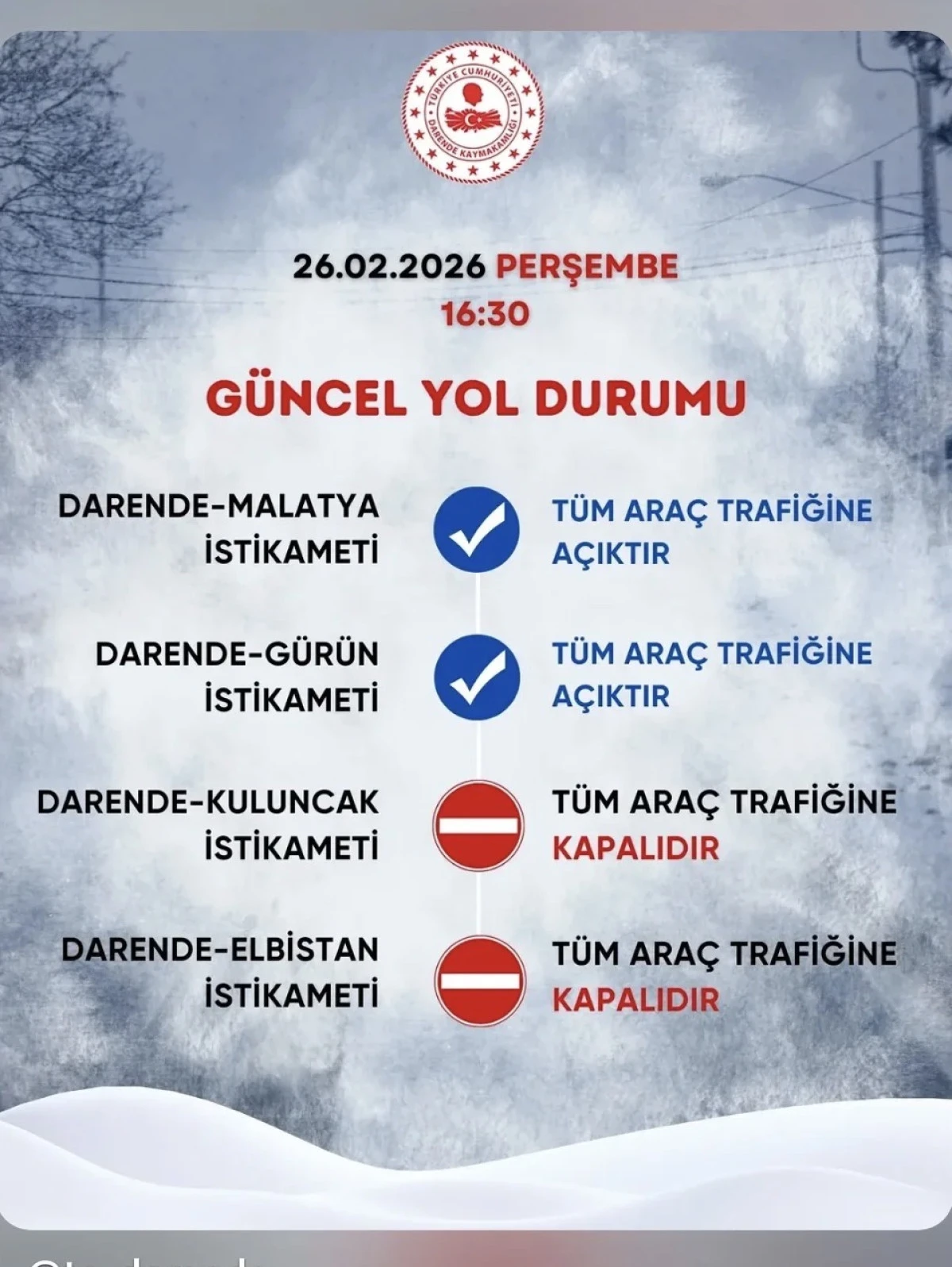 Yoğun kar yağışı ve tipi nedeniyle Darende–Elbistan ile Darende–Kuluncak yolları trafiğe kapatıldı. Bazı güzergâhlarda kontrollü geçiş sağlanırken, ağır tonajlı araçlara izin verilmiyor.
